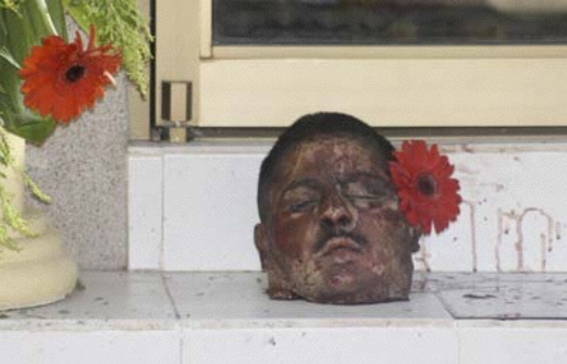In December 2009 while I was shooting my film, El Velador, at a narco cemetery in the Mexican state of Sinaloa, Beltran Leyva, known as “El Jefe de Jefes” (the boss of bosses), was assassinated. A decapitated head was left on his tomb. Initially, I thought it was a threat; later it was explained to me that it was an offering, indicated by the red gerbera daisy placed behind the left ear of the bloodied head. In the photograph that inevitably circulated in the tabloids and on the web, this floral detail stood out brilliantly against the white marble of the tomb. Perhaps the person who left the head on the tomb was not the one who pressed the shutter release on the camera, but when he placed the gerbera behind the left ear, he most certainly knew a photograph would be taken—and knew, moreover, that the more shocking the sight, the more likely it would be to circulate far and wide.