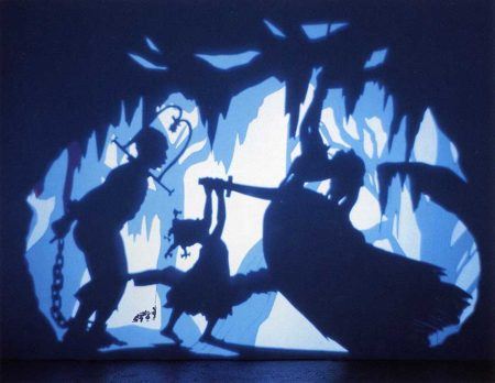 In works like Darkytown Rebellion (2000), the artist uses overhead projectors to throw colored light onto the ceiling, walls, and floor of the exhibition space; the lights cast a shadow of the viewer’s body onto the walls, where it mingles with Walker’s black-paper figures and landscapes. With one foot in the historical realism of slavery and the other in the fantastical space of the romance novel, Walker’s nightmarish fictions simultaneously seduce and implicate the audience.