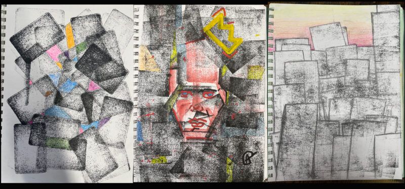 Three different student artworks using stamp pads and various drawing media, inspired by Cubism, Jordan Casteel, and MadC. Courtesy of Gregg Emery.