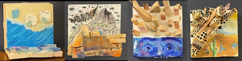 Many of these projects are done in a handmade sketchbook that students create in our early days and others are done outside of this self-made container. For instance, for our Dalí/Drew piece students are given a wooden panel and are prompted to use small wood scraps and build both a ‘surreal scene’ as well as explore with the shapes to build texture, pattern, and a surface that projects. As a starting point, each member of the ‘Making Modern Art’ class decided on a horizon line which on one side was a ‘surrealist landscape’ and on the other was a build-up of various wood pieces and 3D objects. We watched a bit of both artists’ process with the help of online videos and images. The Art21 video from Season 7 featuring Leonardo Drew reveals his art practice in his studio where he goes to work, “not knowing what the works are going to be about but they find their way.” This improvisational method that leads to finding meaning gives students permission to seek without predetermined results but then to consider and establish purpose as they ‘resolve’ the artwork.
