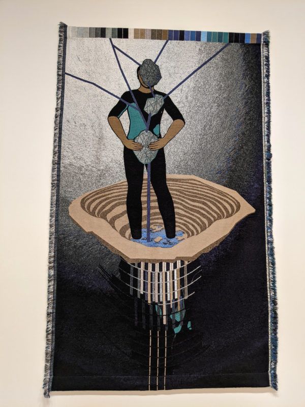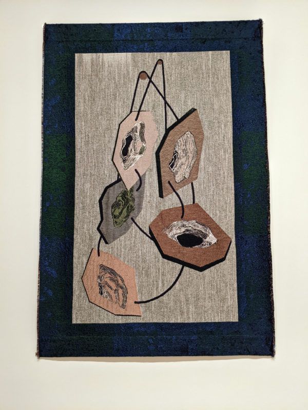 I walk to the larger textile: a map or network layered and woven in the cosmos. The edge of the textile welcomes a figure about to step forward without feet or a brain. It enters the plane on the wall next to urchiny tree branches. Is the figure tethered to circular captions? Is it directing the mechanical arms to pull at the bubble captions? Floating, it feels unmoored even as it appears to be hard at work.