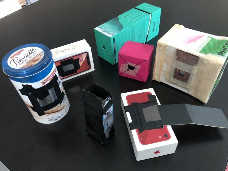 After a few semesters of it and some consultation with other photo teachers, I re-imagined the unit. After a single lesson about camera obscuras and lens optics, I put a random functional pinhole camera on each table of 5 students and told them to figure it out on their own. They had to make a plan for a new camera that would work, tell me what supplies they needed, and provide their own box. The next class they got to work, and we ended up with pinhole cameras made from everything from Apple & Eve juice boxes to Doc Marten shoe boxes, some covered in marker and tape, others in paint and glitter. (Side note for photo teachers reading this: iPhone boxes make great pinhole cameras!) When some cameras didn’t work as intended, students worked as a group to repair them. Eventually, they stumbled their way into a totally handmade pinhole camera. They were free to build and experiment and repair and shoot, and the results were wonderful.