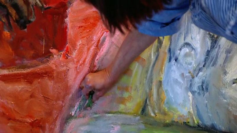 There are few paintings that come fast and sharp. I’m interested in this idea of looking down at a scene to get a different perspective within the painting. I’m sure I got that from Matisse. I can’t say what makes me say, “that’s wrong, that stays, that goes, this should be longer.” Sitting there and looking and going, “I have to do something, and do something, and then do something else,” that’s how a painting gets made.