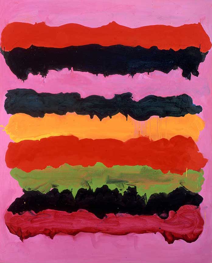 For every piece of Mary Heilmann’s work—abstract paintings, ceramics, and furniture—there is a backstory. Imbued with recollections, stories spun from her youthful fantasies, her flamboyant energy is incorporated into every piece by her use of vibrant colors and sassy monikers—like, Surfing on Acid (2005)—that hint to their significance to the artist. “Expressing emotion is something that I like to do,” says Heilmann. “The relation of parts to the whole piece gives a feeling of feeling…and the titles help.”