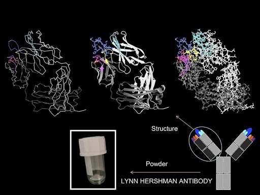Structure of the Lynn Hershman antibody, visualized using PyMOL and presented as a powder in a glass vial. From the Lynn Hershman Leeson: Anti-Bodies, exhibition at HeK (House of Electronic Arts Basel), 2018. Image courtesy of Novartis and the artist.