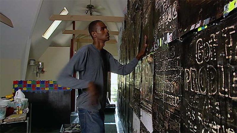 Drawing from the diverse cultural and geographic makeup of his southern Californian community, Bradford’s work is as informed by his personal background as a third-generation merchant there as it is by the tradition of abstract painting developed worldwide in the twentieth century. Bradford’s videos and map-like, multilayered paper collages refer not only to the organization of streets and buildings in downtown Los Angeles, but also to images of crowds, ranging from civil rights demonstrations of the 1960s to contemporary protests concerning immigration issues.