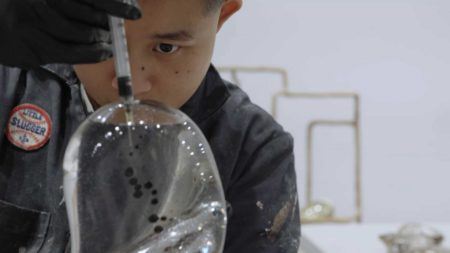 Test tubes and petri dishes feature prominently in Fan’s practice, as the artist often utilizes biological substances such as testosterone, estrogen, and melanin in their sculptures. Fan has worked with a research lab to manufacture and extract these often politically contested materials, detaching them from the context of the body in order to examine their significance. For a series of sculptures entitled Systems, Fan injected testosterone, estrogen, and melanin into organ-like glass-blown globules, which were then precariously hung from forms resembling lattices. In the video work, Mother Is a Woman, Fan used estrogen from their mother’s urine to create a custom beauty cream, asking if qualities like femininity and maternalism usually associated with estrogen could be transferred through a commercial product. Such works question the role that these biological substances have played in constructing binary identity categories and draw upon the artist’s experiences of being racialized and gendered. Ultimately, Fan asks, “How can we be certain that the binary can satisfy us?”