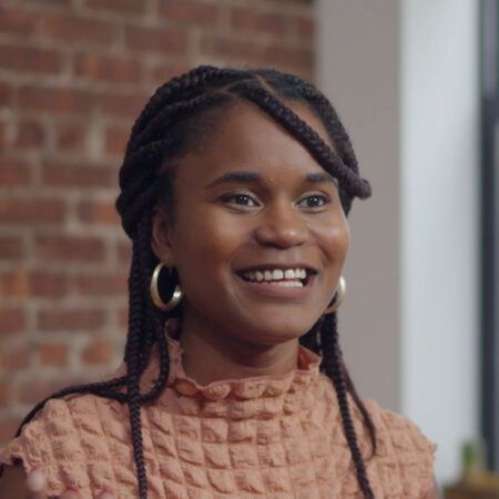 The artist’s video Reparation Hardware (2018) features her as the spokesperson for a fictional home furnishings brand, using authenticity and nostalgia to sell a new line of seemingly useless handmade objects. Throughout the film, Harris-Babou speaks calmly and confidently over a hopeful piano score while making not-so-subtle references to the history of enslavement, the Reconstruction era, and the possibility of reparations in the United States. “I do like to operate in this space where the videos at first look like something you’re really familiar with or comfortable watching,” says the artist. “Then I start to insert these uncomfortable things, these uncomfortable truths into a familiar form and see what happens when that friction comes up.” In works like Decision Fatigue (2020) or Cooking with the Erotic (2016), the artist juxtaposes the clean, cheerful, tasteful aesthetics and recognizable buzzwords of tutorial videos with off-kilter narration about power, breastfeeding, and the erotic, using strange concoctions like a Cheeto-dust exfoliant or a slurry of grains and blue paint in the works.
