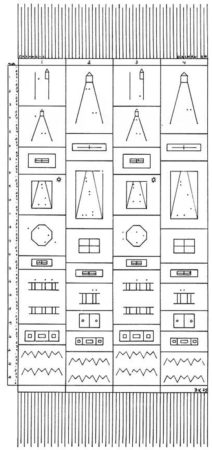 A pioneer of video art, Korot founded the video magazine Radical Software with Phyllis Gershuny and Ira Schneider in 1970, shortly after the release of the first commercially available portable camera, Sony’s Portapak. The magazine served as a way for artists working in the medium to exchange information about the new tools that were available to them. “I always had the attitude towards technology that the more intimate you are with the tools that you get, the more you can tell your story,” she says. Korot’s film Dachau (1974) (1974), builds a narrative structure and feeling of movement by employing a rhythmic weaving of images through four distinct, side-by-side channels. In this black-and-white video installation, the artist edits footage of the German concentration camp into short repeating clips that flow into one another, combined according to the logic of a loom program. In her installation, Text and Commentary (1976-77), the artist displays five videos of herself working at a loom alongside the resulting tapestries. The installation also includes schematic diagrams for each of the weavings and a pictographic score illustrating how she edited the videos. Considering the loom to be the first computer, Korot creates a parallel between the tapestries and their schematic drawings and the videos and their scores.