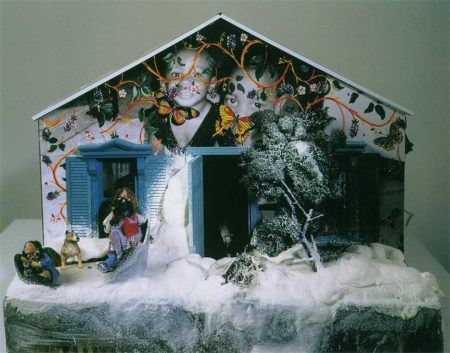 Alongside his installation work, Osorio creates sculptures that further express his intent in centering community care and engaging local audiences materially and conceptually. “My principal commitment as an artist is to return art to the community,” he says. His series Home Visits (1999-2000) consists of small movable sculptures that move from house to house, inviting different families to live with the works for a week. In one of the moveable sculptures, Tina’s House (2000), the artist constructs a dollhouse that narrates the story of Philadelphia resident Tina Rosado and her two daughters, who lost everything in a house fire. By inviting different families to live with the work, the artist recalls the Puerto Rican tradition of the visiting saint, where religious iconography is borrowed from the church for a short period of time. In doing so, he elevates the role of his community and its people, spreading awareness about Latinx and Afro-latinx stories, and creating a communal space for support and care.