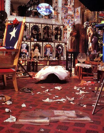 In his work, Osorio engages Latinx and Afro-Latinx communities in the conception of new projects and bases the success of his work on its impact on his communities. En la barbería no se llora (No Crying Allowed in the Barbershop) (1994) is a mixed-media installation inspired by the artist’s first haircut. Osorio constructs a barbershop laden with symbols of masculinity from car seats, sports paraphernalia, trophies, action figures, and videos of men in conventionally masculine poses to comment on machismo in Latinx communities and its heightened role in male-dominated spaces such as barbershops. In “Scene of the Crime (Whose Crime?)” (2003), the artist depicts a maximally decorated living room that has become a crime scene, a figure covered in a bloody white tarp lies on the floor surrounded by religious iconography, Puerto Rican flags, and ornate furnishings. Yellow police tape separates the installation from the viewer, considering the complicity of the spectator in this scene of violence, as the work draws upon the stereotypical depictions of Latinx homes and cultures found in popular film and television. Osorio asks himself, “How do Latinos see themselves? How do I see them? How are we seen by others?”