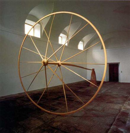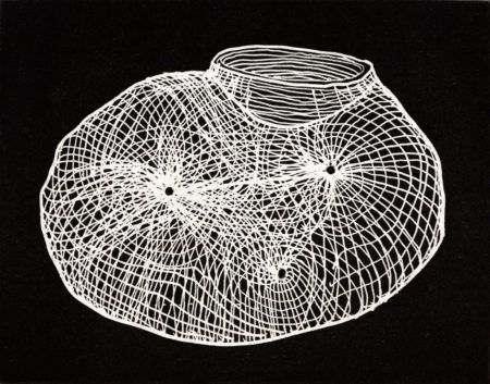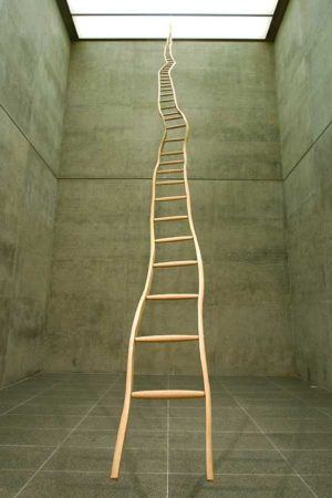In Ladder for Booker T. Washington, Puryear built a spindly, meandering ladder out of jointed ash wood. More than thirty-five-feet tall, the ladder narrows toward the top, creating a distorted sense of perspective that evokes an unattainable or illusionary goal. In the massive stone piece, Untitled, Puryear enlisted a local stonemason to help him construct a building-like structure on a ranch in northern California. On one side of the work is an eighteen-foot-high wall—on the other side, an inexplicable stone bulge. A favorite form that occurs in Puryear’s work, the thick-looking stone bulge is surprisingly hollow, coloring the otherwise sturdy shape with qualities of uncertainty, emptiness, and loss.