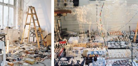Sarah Sze was born in Boston, Massachusetts in 1969. Sze builds her installations and intricate sculptures from the minutiae of everyday life, imbuing mundane materials, marks, and processes with surprising significance. Combining domestic detritus and office supplies into fantastical miniatures, she builds her works, fractal-like, on an architectural scale.