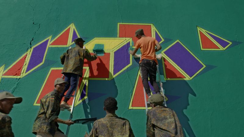 Robin Rhode and his team of assistants. Production still from the Art in the Twenty First Century Season 9 episode, "Johannesburg.". © Art21, Inc. 2018.