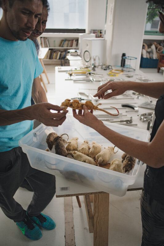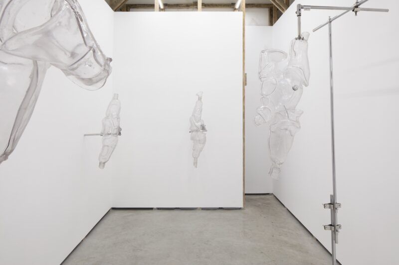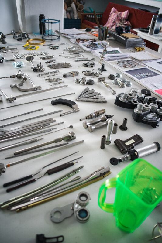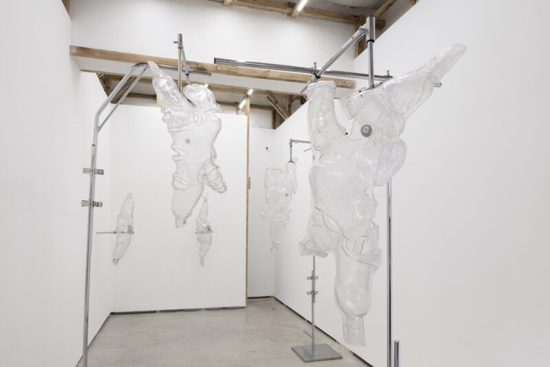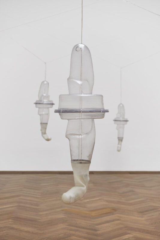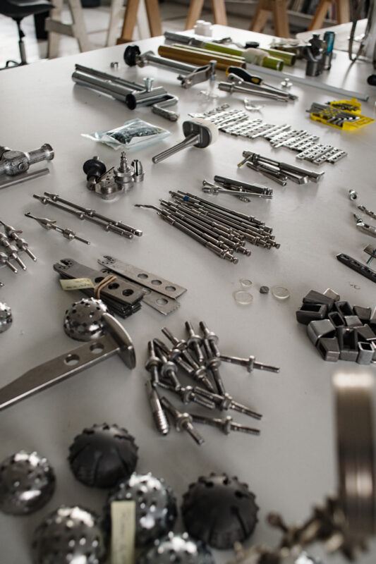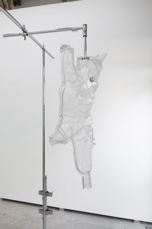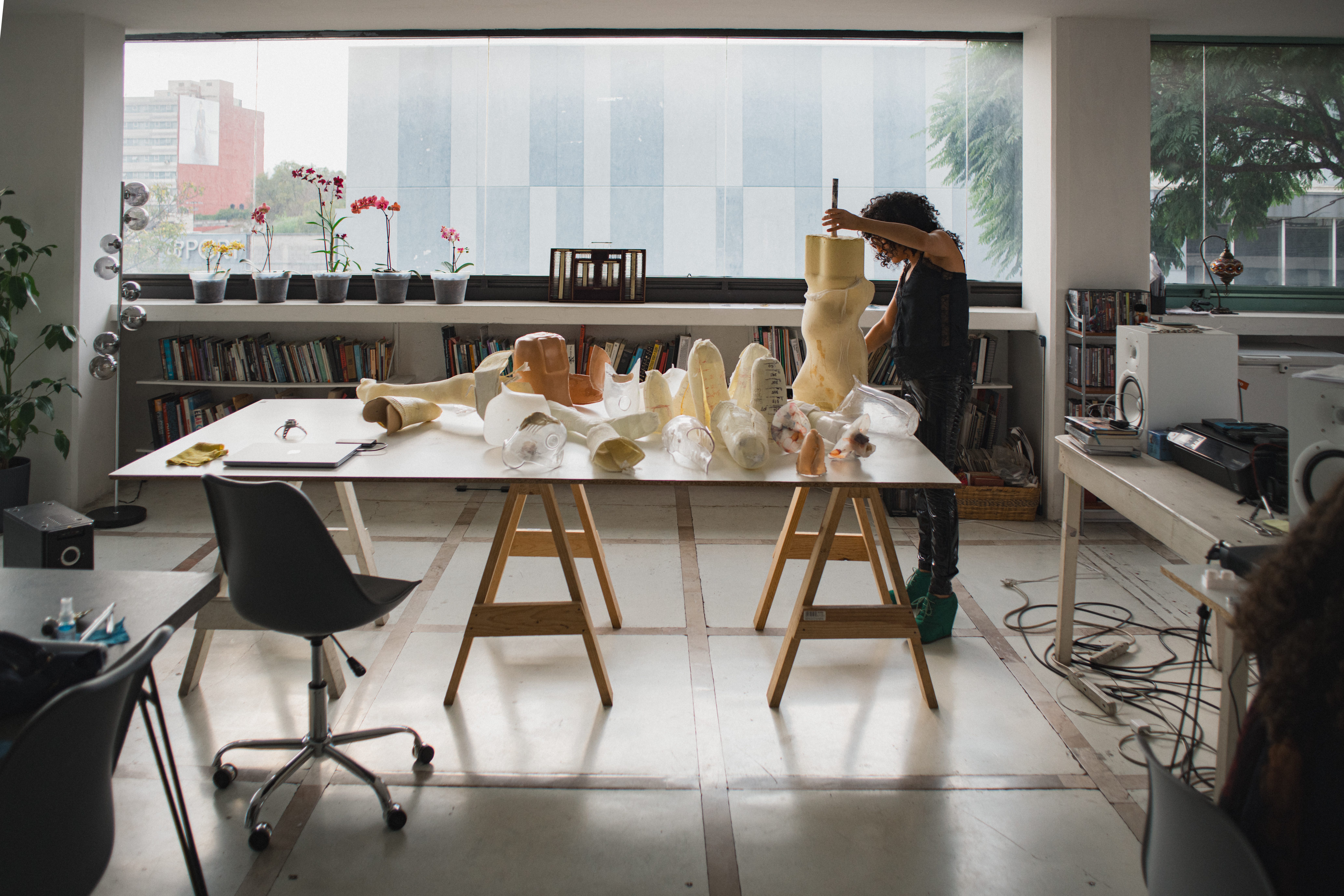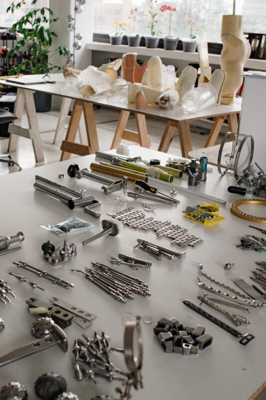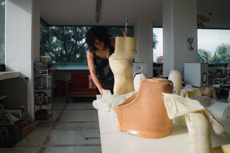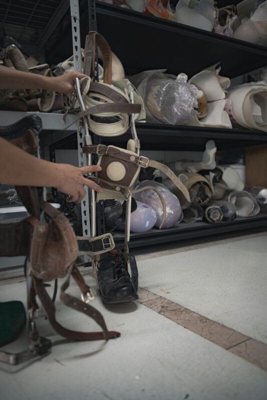La primera relación con los materiales es un encuentro. Suelo trabajar como pepenadora, buscando entre la basura y en los desechos de los talleres de ortopedia. Ya sea que comience la búsqueda en tianguis, en cosas de segunda mano o de chácharas como se dice aquí en México. Por ejemplo, en el caso de los liners de silicona para mi proyecto Hic et Nunc (2022), ¿cómo di con ellos yo? ¡Ni siquiera sabía que existían! Hay una fase que es fundamental cuando yo estoy trabajando de la mano con personas que son expertas en su campo. Siempre les preguntó sus opiniones, no solo respecto a los materiales, sino también a todas las patologías que han conocido. Como no es mi rama, necesito un bagaje, un horizonte desde el cual partir para poder conceptualizar la idea de una escultura o un proyecto.